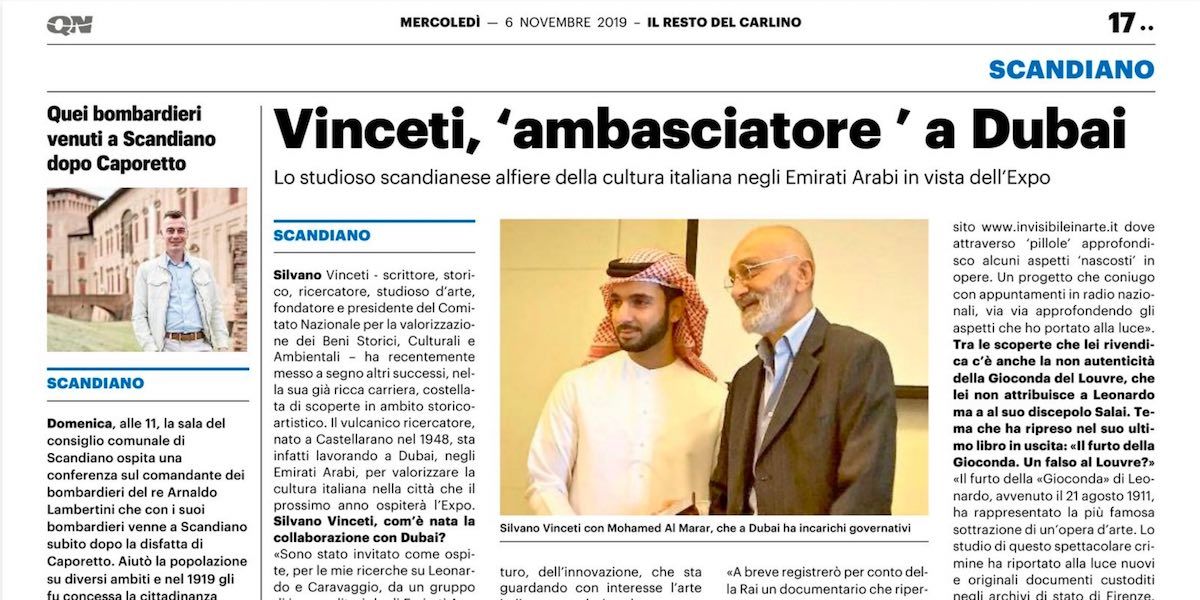 Silvano Vinceti è stato invitato come ospite, per le sue ricerche su Leonardo e Caravaggio, da un gruppo di imprenditori degli Emirati Arabi che negli ultimi tempi hanno allargato i loro interessi economici all'ambito culturale, con particolare attenzione all'Italia. Tra i progetti messi in cantiere tre mostre virtuali che raccontano l'opera di Caravaggio, di Leonardo e la Gioconda che saranno collocate all'interno del museo sul futuro, non lontano da dove si terrà l'Expo. Intanto Vinceti ha in vista alcune interviste impossibili con grandi artisti del passato per Radio Vaticana e un documentario della Rai su Raffaello.
